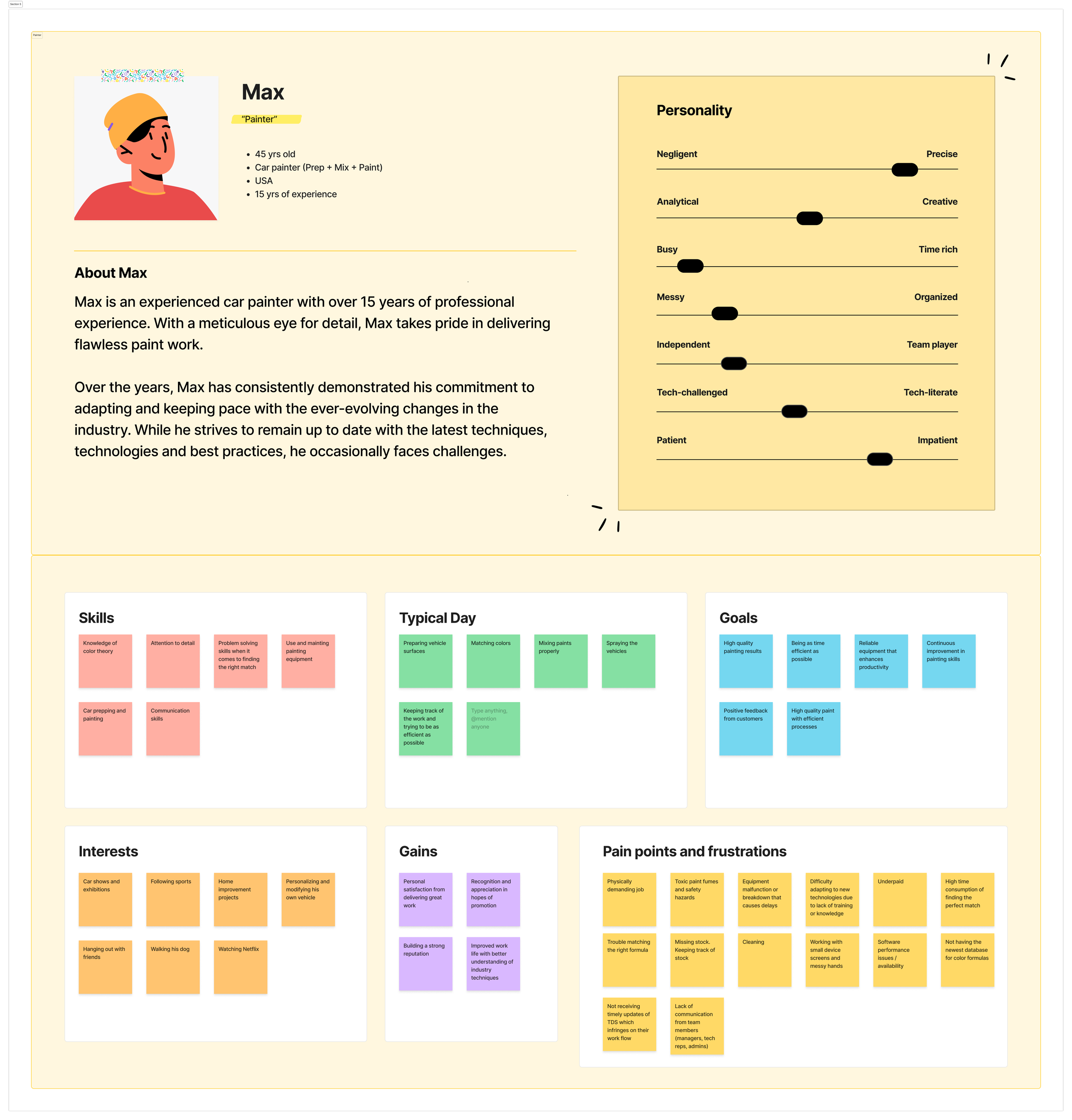 Insights from the field visits informed the creation of a dedicated painter persona that represented their goals, constraints, and end-to-end color workflow. This persona became my north star throughout the redesign, grounding design decisions in real-world behaviors and ensuring the experience consistently supported painters in their day-to-day work.