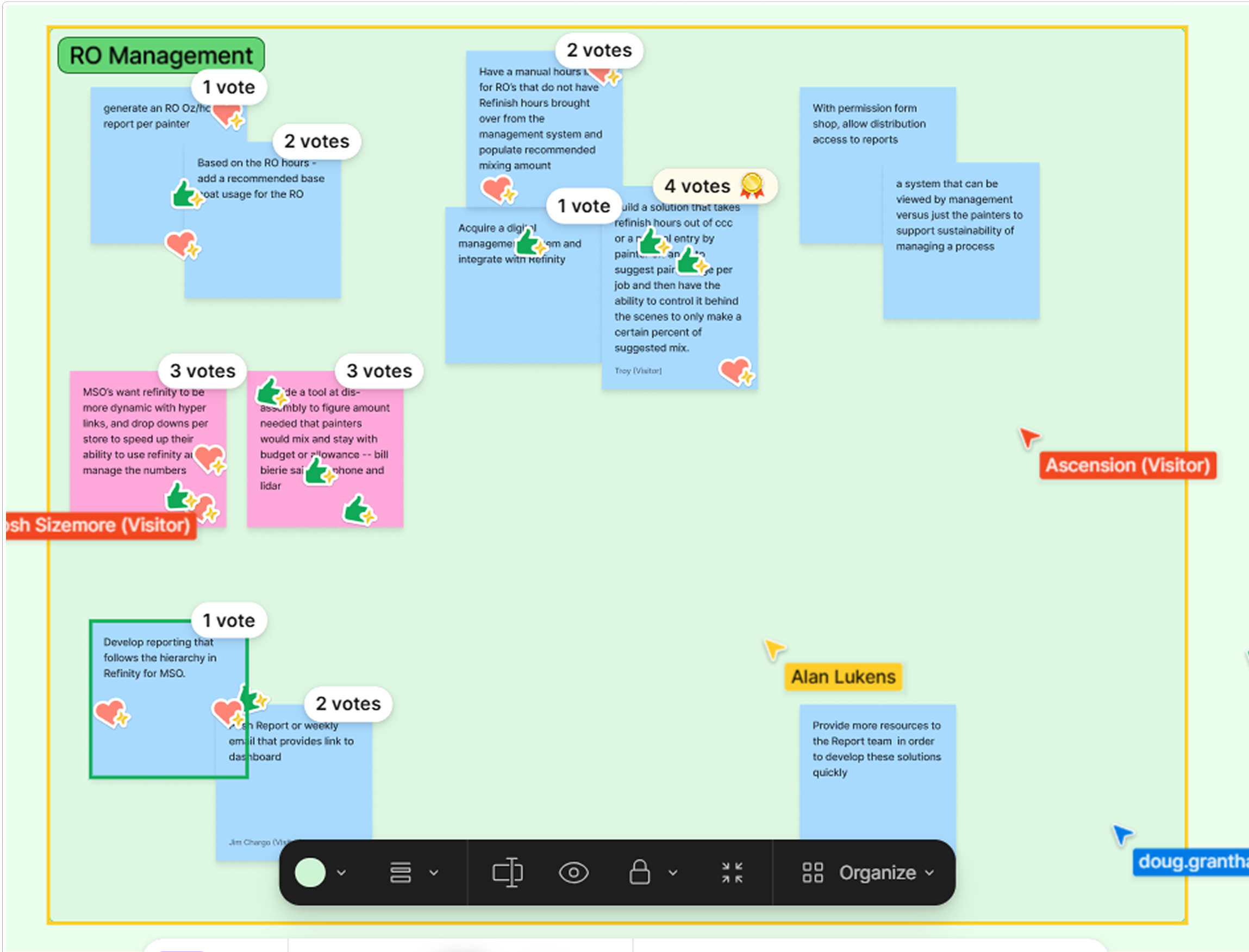Despite asking participants to come prepared with problem statements, many of the stickies were extremely long, solution focused, or even irrelevant. Some were full word dumps that combined multiple problems and proposed fixes all in one. Instead of stepping in immediately to “fix” it, I had the group vote on the problem statements as they were. This shifted the cognitive load away from me and forced the group to reflect on what they believed mattered most.